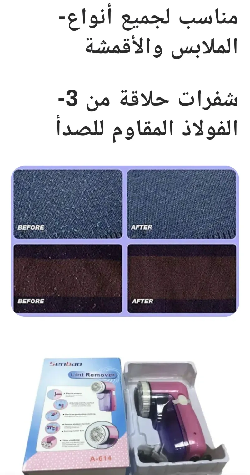 هي طريقة أنيقة لإزالة الفقاعات والزغب والحبوب والوبر من الأقمشة المنزلية، مما يجعل حياتك مختلفة عن الآخرين، إنها أداة العناية بالملابس المثالية لتكون في متناول اليد، صغير ومحمول مناسب للمنزل أو السفر، تضمن مساحة سطح الشفرة الكبيرة تغطية مساحة واسعة في الملابس لذلك تحتاج العملية إلى تمريرات قليلة للتخلص من الوبر، لجعل ملابسك تبدو جديدة مرة أخرى، نظرًا لأحجام الفتحات المختلفة، سيتم شفط جميع أحجام حبوب النسيج وإزالتها من القماش بشكل فعال تحتوي ماكينة الحلاقة هذه على محرك قوي يقوم بتشغيل ثلاث شفرات حادة مقاومة للصدأ للعمل بسرعة عالية، الإضافة إلى ذلك، هناك شفرة بديلة مرفقة في العبوة.